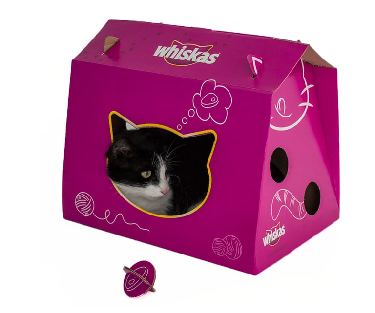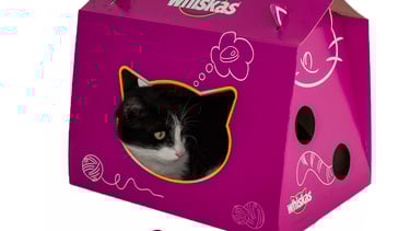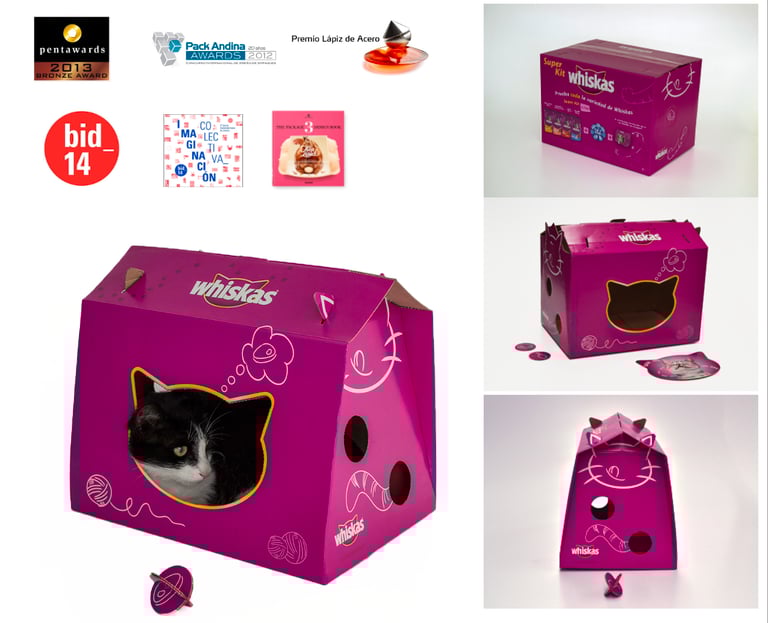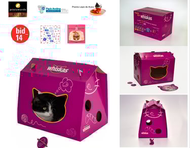 Promotional cat foot and litter packaging. The issue with loading and volume it is solved with a box in a conventional cardboard. With some engravings and pre-cuts can be reused after its purchase and would be also a house for the cat (do not require the use of tools or glue). This was a plus for the brand and keeps in the mind of the buyer.
